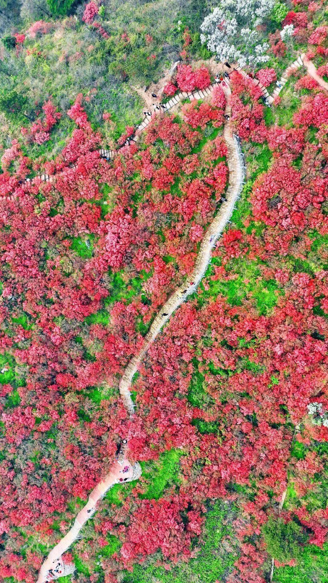 网友@小东在攻略中形容:“从山脚到山顶,仿佛开了渐变滤镜,转角直接撞进满屏视觉核爆,简直是红色暴击!” 网友“珊珊”前往打卡后表示,“从磨山南门一进去,直接撞进花海漩涡。最绝的是古树掩映下的杜鹃,枝干苍劲,花朵娇美,反差感拉满!”