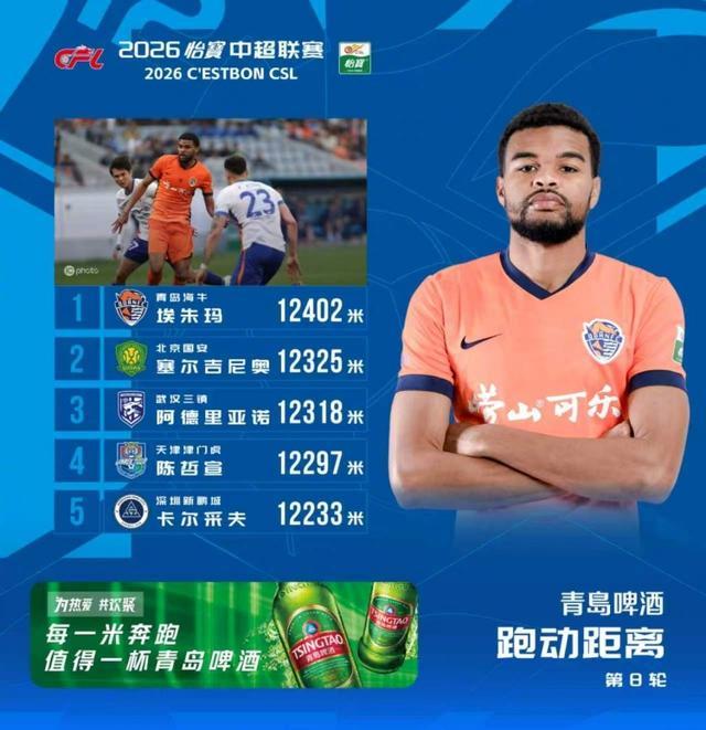 直播吧4月28日讯 中超联赛官方公布了第8轮球员跑动榜,青岛海牛外援埃朱玛跑动距离达到12402米,排名本轮跑动距离榜首位。此外,塞尔吉尼奥、阿德里亚诺、陈哲宣、卡尔采夫进入跑动榜前五。