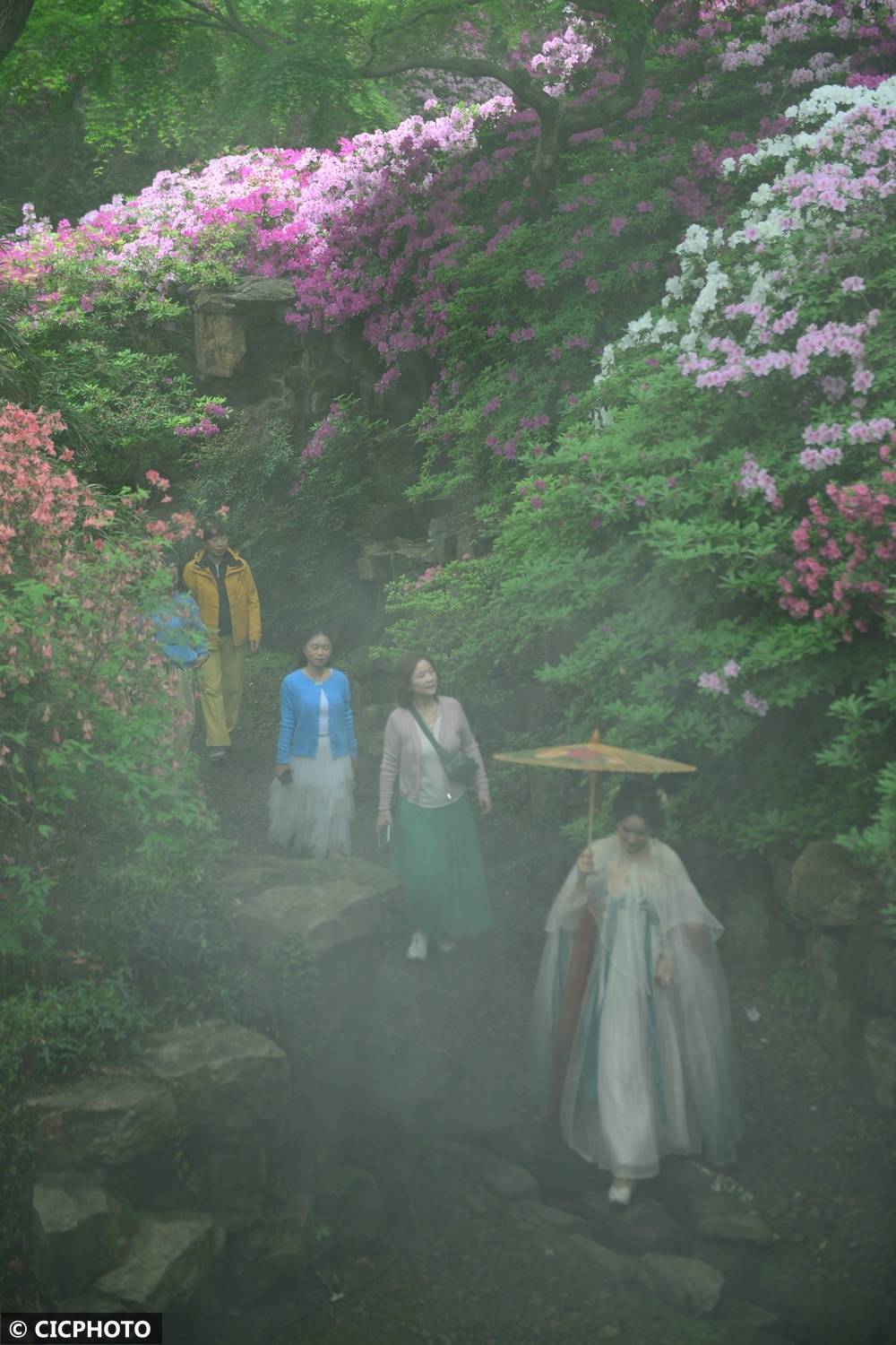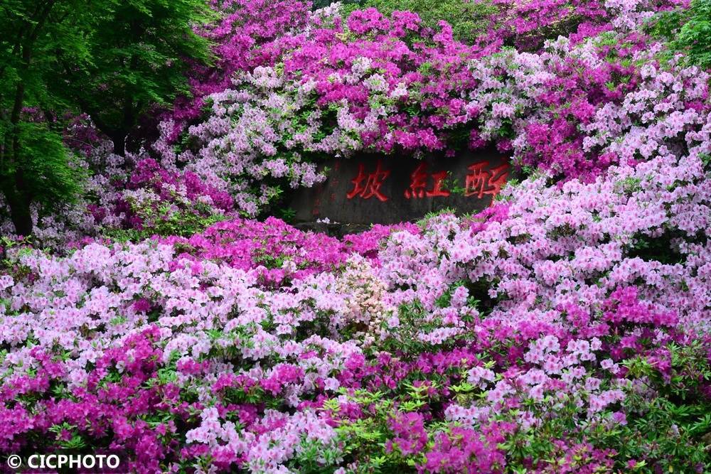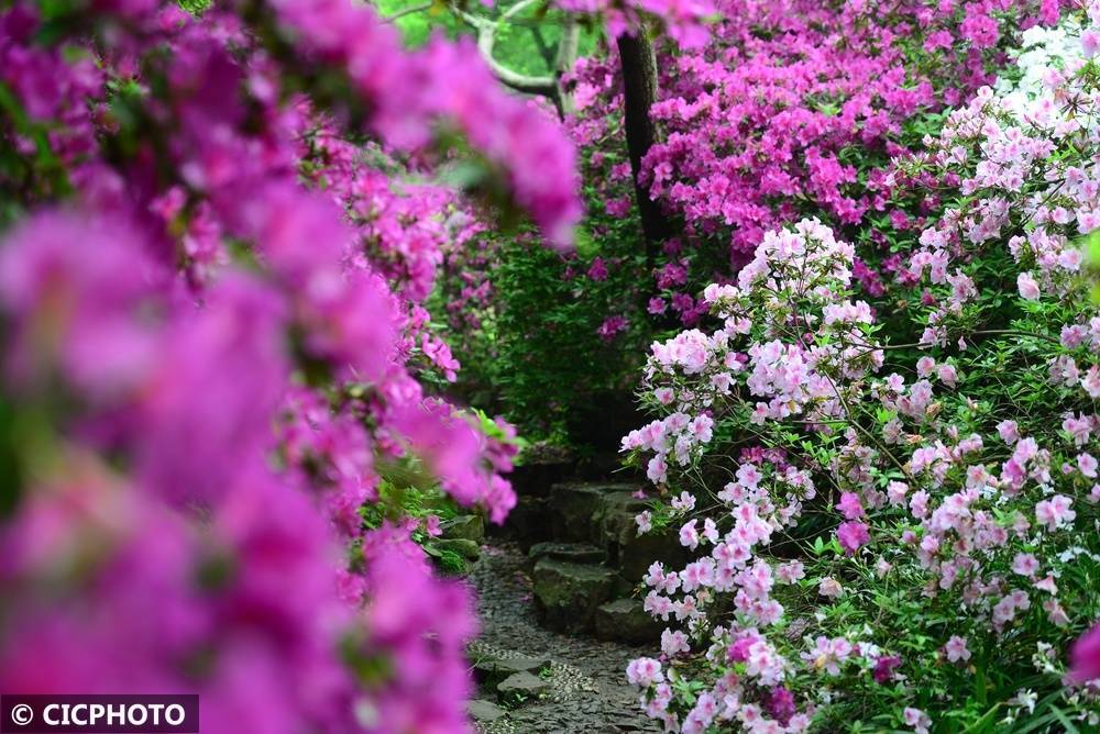 ↑2026年4月15日,游客在江苏省无锡市惠山古镇中国杜鹃园赏花游览。CICPHOTO/张则鸣 摄
