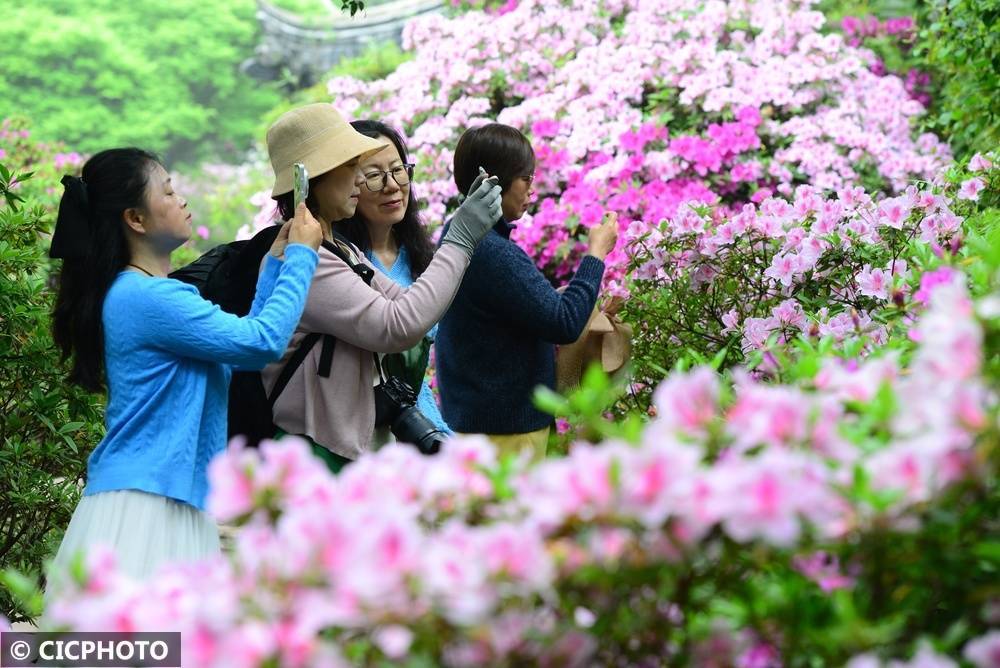 ↑2026年4月15日,游客在江苏省无锡市惠山古镇中国杜鹃园赏花拍照。CICPHOTO/张则鸣 摄